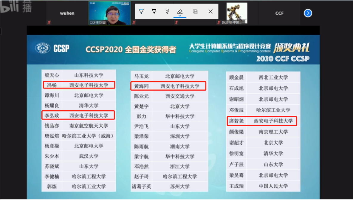 (通讯员 陈龙)2020年全国大学生计算机系统与程序设计竞赛(2020 CCF CCSP)于10月17日进行,西安电子科技大学派出29名选手参加,经过六个小时不间断鏖战,最终全国总决赛获得四金一银八铜,团体排名位列全国第八,取得历史最好成绩;西北赛区获得五金八银十三铜,团体排名位列西北区域第二。本次大赛全国66所高校同时在线下举行,分为西北、华北等七个赛区,共有1041名选手参加。