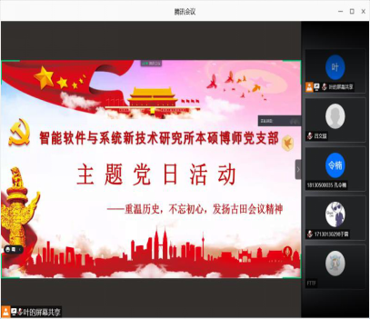 (通讯员 张恒运)为庆祝中国共产党建党100周年,深入学习贯彻习近平总书记在党史学习教育动员大会上的重要指示精神,从党的非凡历程和实践中汲取初心使命的力量,世界杯(中国)智能软件与系统新技术研究所本硕博师联合党支部于2021年5月28日下午开展了“重温党史,不忘初心,发扬古田会议精神”主题党日活动。活动由支部副书记吕文琪同志主持,共计56人参加,会议以线上和线下的方式进行展开。