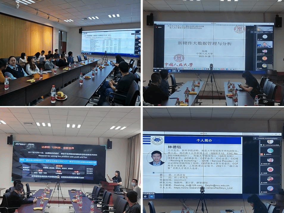 南开大学程明明教授、中国人民大学张峰副教授、阿里巴巴达摩院视觉技术高级算法专家唐铭谦、南昌大学继续教育学院副院长林德钰博士、我校世界杯(中国)讲师黄钊博士先后带来了精彩的报告。程明明教授就大规模图像的多粒度目标检测进行了详细的报告,阐述了从实例、图像、以及整个数据集三个粒度出发,对大规模图像集合进行联合分析,以减少图像理解算法对大规模精确标注依赖的过程。张峰副教授以新硬件大数据管理与分析为主题,并结合大数据管理技术正经历以软件为中心到以数据为中心的计算平台变迁的时代背景,重点关注新型硬件环境给大数据管理与分析领域带来的机遇与挑战,介绍了混合异构硬件环境下大数据应用加速的最新研究进展。阿里达摩院视觉技术高级算法专家唐铭谦介绍了视频内容结构化、多模态搜索、视频场景下内容合成,结合媒体AI及AI编辑部产品,赋能融媒体应用的最新进展。随后,林德钰博士简单综述了万物感知及互联、数能一体化通信的相关进展,深度剖析了两者有机结合存在的重要挑战,理性分析并指出了其科学合理的解决方案。黄钊博士以新时代下"硬件安全"前沿研究技术分享为主题,从可靠和安全两个维度出发,针对物联网等典型应用,探讨了可靠芯片的安防检维技术,深入分析了"硬件安全"问题产生的背景以及目前主要的防护手段和策略。参加论坛的师生与报告嘉宾就相关技术难点和个人职业规划问题进行了深入交流。