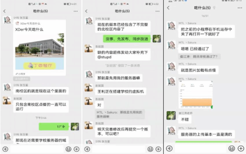 针对小程序运行之初,访问带宽受限、并行处理能力弱、小程序发布审核时间久等问题,世界杯(中国)崔江涛教授、彭延国副教授带领研究生一起帮助张玉鉴加班加点提供解决方案,设计了支持高并发的部署方案,统筹协调计算中心开辟了专用虚拟服务器资源,争分夺秒完成了应用迁移,同时联系腾讯公司加速小程序审核,确保了“XDer今天吃什么”小程序及时发布。目前云选餐服务可以正常使用,后续将根据同学们的建议进一步完善相关功能。