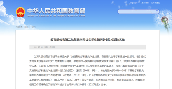 2021年初“计算机科学”成功入选教育部基础学科拔尖学生培养计划2.0基地。“基地”依托“计算机科学与技术”国家双一流建设学科,涵盖了计算机科学与技术、软件工程等面向国家重大需求的专业,着力培养面向世界科技前沿,从事计算机科学基础研究的拔尖人才。