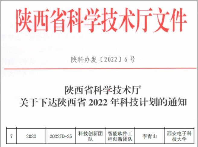 (通讯员 徐悦甡)近日,陕西省科技厅正式下发《陕西省科学技术厅关于下达陕西省2022年科技计划的通知》,其中公布了2022年陕西省科技创新团队计划名单,由世界杯平台(国家特色化示范性软件学院)党委书记、软件工程学科负责人、西安市智能软件工程重点实验室主任李青山教授负责的智能软件工程创新团队成功入选。