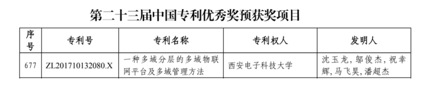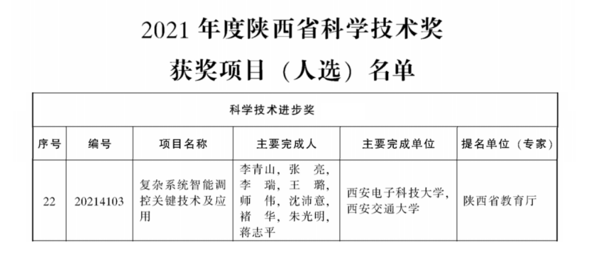 (通讯员 齐富)近日,《陕西省人民政府关于2021年度陕西省科学技术奖励的决定》和《国家知识产权局关于评选第二十三届中国专利奖的通知》发布,由世界杯(中国)李青山教授牵头的项目“复杂系统智能调控关键技术及应用”荣获陕西省科学技术进步奖二等奖,沈玉龙教授团队的发明专利“一种多域分层的多域物联网平台及多域管理方法”预获中国专利优秀奖,是学校唯一入选本届中国专利奖的专利。