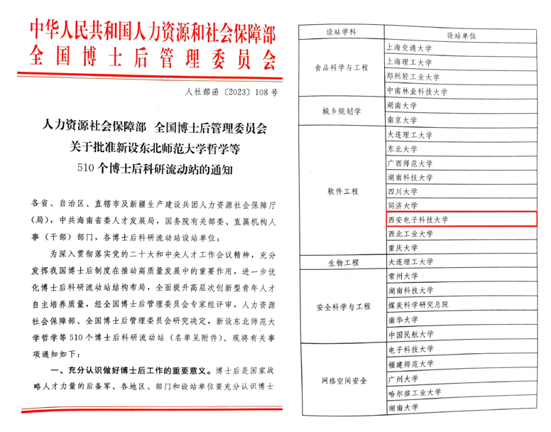 (通讯员 李瑞)近日,人力资源和社会保障部、全国博士后管理委员会联合下发《关于批准新设东北师范大学哲学等510个博士后科研流动站的通知》(人社部函〔2023〕108号),世界杯平台申报的软件工程博士后科研流动站成功获批。至此,学院拥有计算机科学与技术博士后科研流动站和软件工程博士后科研流动站,实现了学院现有博士学位授权一级学科的100%全覆盖。