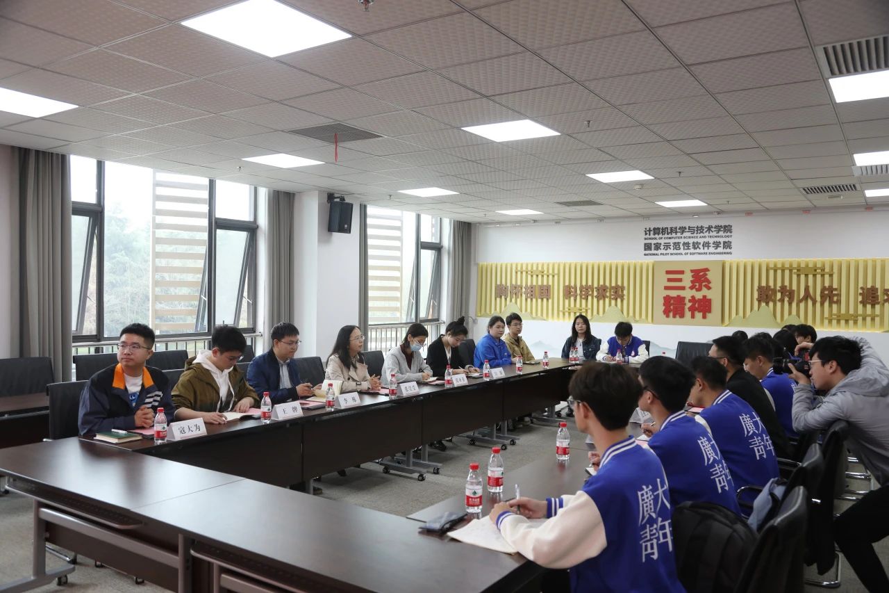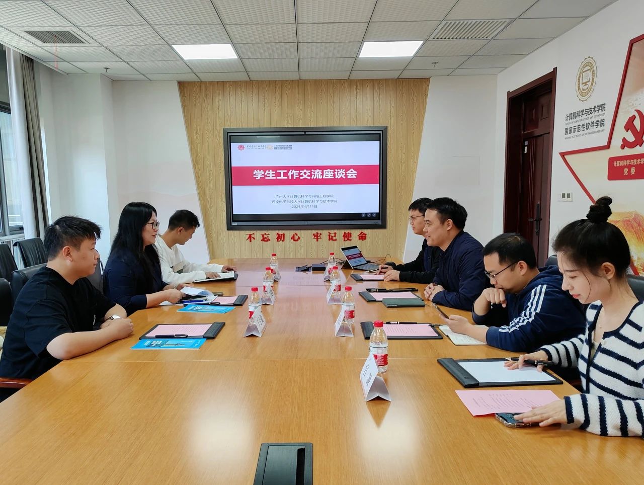 4月11日上午,学生工作交流座谈会在南校区网安大楼A1-222会议室召开。西电世界杯(中国)党委副书记黄成龙、辅导员党支部书记梁双杰、团委书记李栋、辅导员宫源以及广州大学计算机科学与网络工程学院党委副书记吕延明、辅导员肖章益、丁子旋参会。