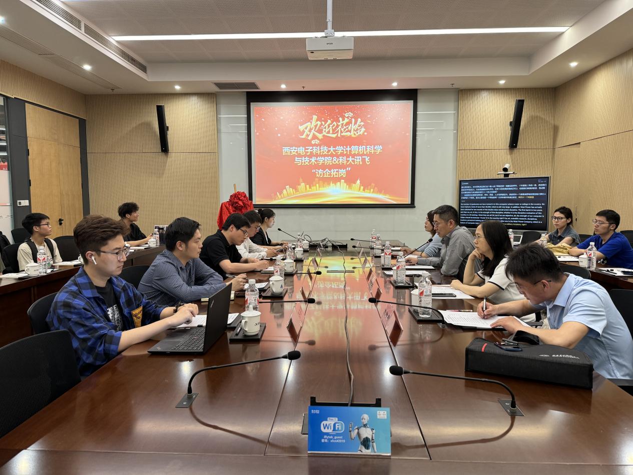 参观结束后,双方就深化校企合作,协同加强科研攻关、智能教育、就业育人等进行座谈交流。科大讯飞西安研究院副院长来意哲对世界杯(中国)师生一行的到访交流表示热烈的欢迎。崔江涛就学院历史沿革、专业设置、学科建设、科研师资、人才培养优势等方面做了简要介绍。他表示,科大讯飞作为高校科研成果转化的企业典范,在人工智能和计算机领域都有着卓越的成绩和贡献。学院高度重视产学研融合发展,一直持续深化与对口企业的科研联合攻关,希望下一步与科大讯飞在重大科研项目、创新人才培养等方面建立深度合作。双方还就下一步开展在AI+教育领域的合作进行了深入交流。