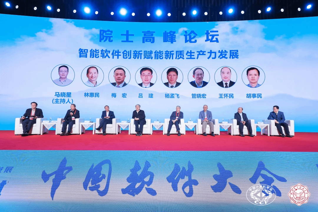 院士高峰论坛由CCF软件工程专委会主任、南京大学马晓星教授主持。出席论坛的两院院士包括中国科学院院士林惠民、中国科学院院士梅宏、中国科学院院士吕建、中国科学院院士杨孟飞、中国科学院院士管晓宏、中国科学院院士王怀民、中国科学院院士胡事民。