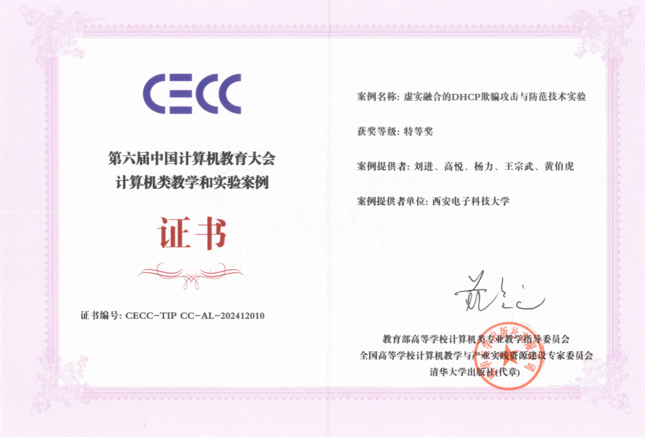 本次大会的计算机类教学和实验案例竞赛自启动以来,吸引了来自全国各地上百所高校的积极参与,共有370多项作品参赛。经过层层遴选和严格评审,世界杯(中国)教师刘进、高悦等共同设计提交的实验案例“虚实融合的DHCP欺骗攻击与防范技术实验”荣获特等奖。