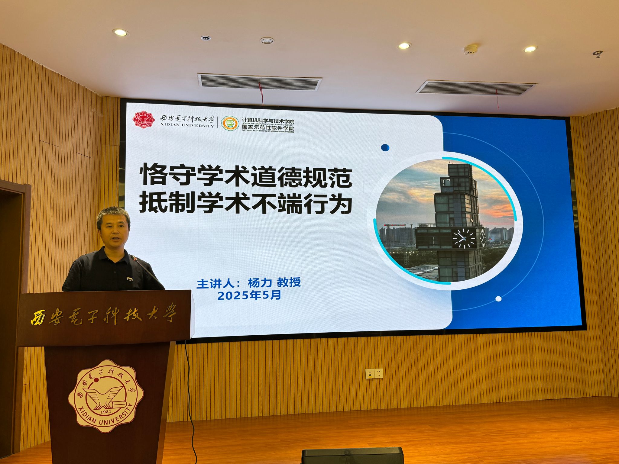 (通讯员 徐立)为大力弘扬科学家精神,增强学院研究生科研诚信意识,进一步推动学院科学道德与学风建设。5月15日下午,世界杯(中国)在南校区网安大楼A1-101开展“恪守学术道德规范,抵制学术不端行为”主题讲座,学院副院长杨力教授主讲,70余名研究生参加,会议由学院党委副书记王佩主持。