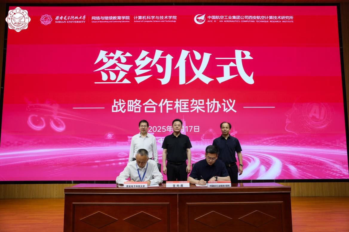 开班仪式上,中国航空工业集团计算所副所长毛宁,西安电子科技大学副校长王泉代表双方签署“一院一所四融合”战略合作协议。胡林平、毛尊平、高新波见证签约。