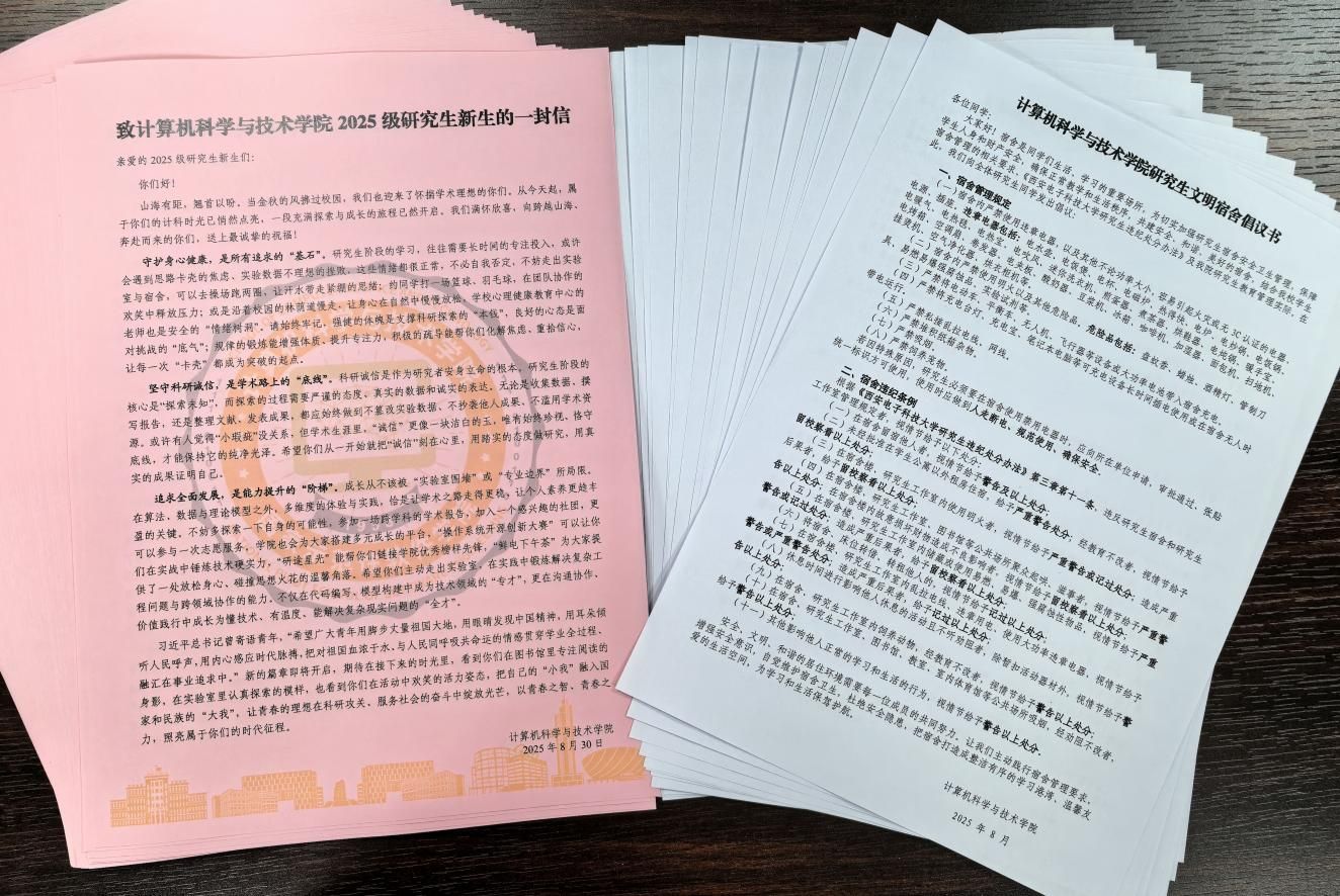 在用心打磨、精心制作后,学院为每位新生发放《致世界杯(中国)2025级研究生新生的一封信》,字里行间既包含对新生加入计科大家庭的欢迎,更围绕“如何度过有价值的研究生时光”展开深度引导,为研究生阶段的学习、科研与生活筑牢根基;学院现场组织新生学习《世界杯(中国)研究生文明宿舍倡议书》,志愿者通过案例教育、制度解读的方式,向新生重点强调宿舍用电安全、消防安全和卫生管理等方面的要求,让安全意识、文明意识从入学第一天便深植心间。
