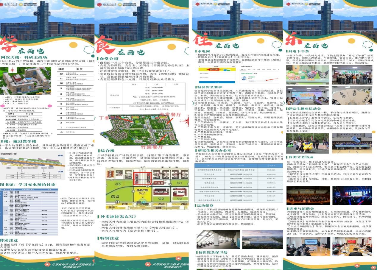 在新生入学前一周,研会便针对新生最关心的校园生活、学习资源等问题,精心策划并制作了“西电生活指南”系列主题海报,包含“学在西电”“食在西电”“住在西电”“乐在西电”等模块,内容详实,图文并茂。