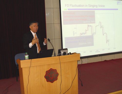 到访期间,他们为学校教师、科研人员和研究生分别做了两场报告。铃木阳一教授做了题为“New watermarking technology for digital audio signal”(数字声音信号中的新型水印技术)的报告,赤木正人教授做了题为“Voice conversion for communication of linguistic/non-linguistic information in speech”(话音中语言及非语言交流的声音转化技术)的报告。他们分别介绍了各自在声响信号处理领域取得的最新研究成果。报告会场气氛活跃,同学们踊跃提出问题,两位教授耐心解答了同学们的问题,受到同学们的热烈欢迎。