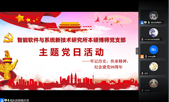 (通讯员 贺同庆)为庆祝建党99周年,重温党的光辉历史,传承弘扬革命先辈的奋斗精神,世界杯(中国)智能软件与系统新技术研究所本硕博师联合党支部于2020年7月1日召开了“牢记历史,传承精神——庆祝建党99周年”主题党日活动。本次活动由支部青年委员王旭东同志主持,活动共计39人参加,采用腾讯会议线上召开的方式进行。