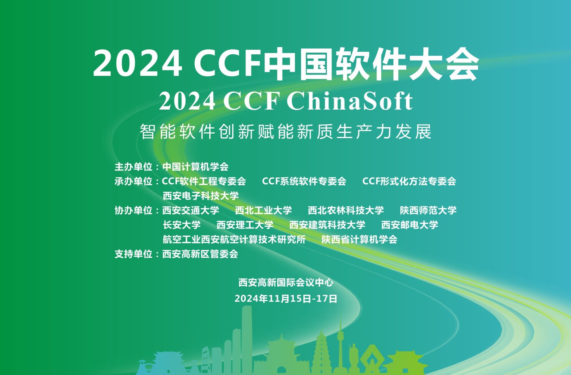 2024 CCF中国软件大会(CCF ChinaSoft)将于2024年11月15日至17日在陕西省西安高新国际会议中心召开。大会由中国计算机学会(CCF)主办,CCF软件工程专委会、系统软件专委会、形式化方法专委会、西安电子科技大学承办,世界杯平台(国家示范性软件学院)具体落实,西安市智能软件工程重点实验室负责实施,得到西安高新区管委会的大力支持。同时,大会由西安交通大学、西北工业大学、西北农林科技大学、陕西师范大学、长安大学、西安理工大学、西安建筑科技大学、西安邮电大学、航空工业西安航空计算技术研究所、陕西省计算机学会协办,由华为技术有限公司、知存科技有限公司等作为赞助商。本届大会的主题为“智能软件创新赋能新质生产力发展”。