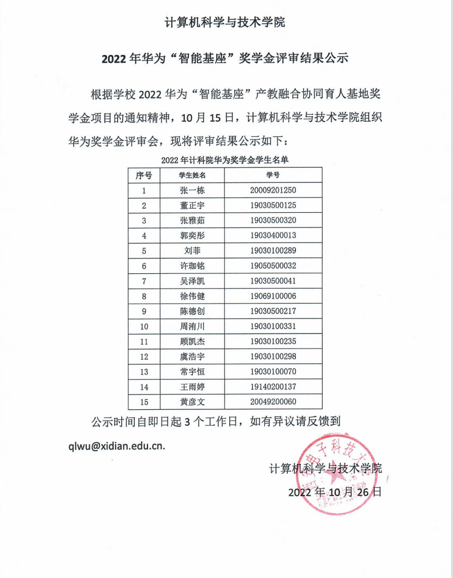 世界杯(中国)2022年华为“智能基座”奖学金评审结果公示