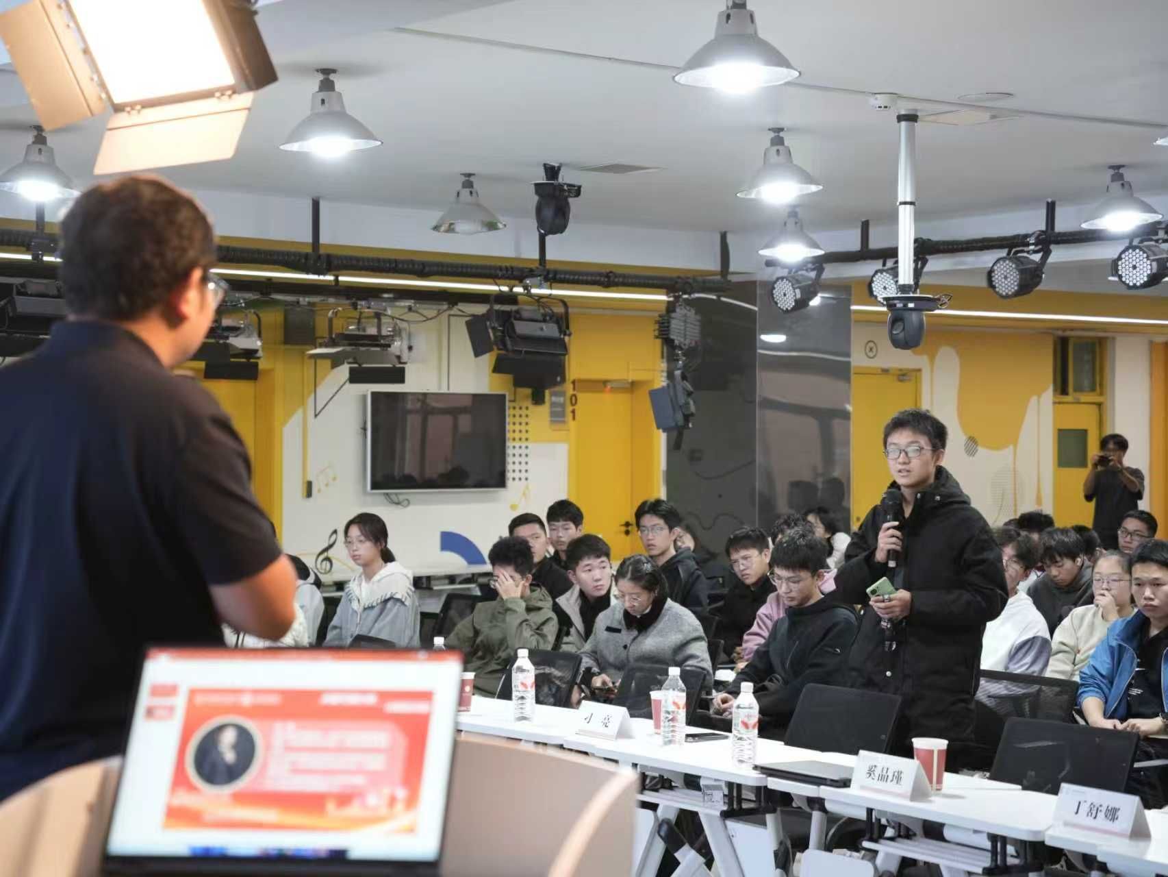 在互动交流环节,同学们围绕“科技竞赛参与”“程序员职业发展”“技术与管理路径如何选择”等问题踊跃提问。刁亮结合自身经验耐心解答,鼓励大家在尝试和试错中找到自我优势,并为每一次机会做好充分准备,现场气氛一度热烈。
