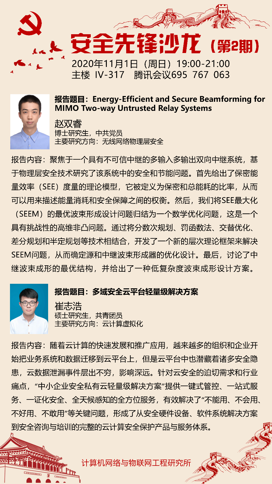 据悉,“安全先锋沙龙”主题报告活动的预期建设效果是在不同培养阶段学生之间搭建起一个学术科研交流的常态化平台,是计算机网络与物联网工程研究所落实三全育人要求,践行“推进党建和业务融合应常态化制度化”的积极探索与实践。活动每两周进行一次,每期组织安排研究所各个方向的博士和硕士研究生分别介绍各自专业领域的理论与技术新进展,欢迎对计算机网络、物联网、云计算及其安全主题感兴趣的师生通过线上或线下的方式参与。