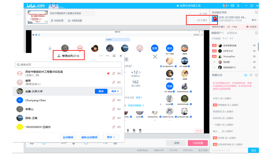 8月26日上午的报告由重点实验室张亮教授和朱光明副教授主持,加拿大阿尔伯塔大学马雷副教授、新加坡管理大学谢肖飞博士、南开大学张圣林副教授、西北工业大学闫庆森教授、西安电子科技大学崔笛博士、西安电子科技大学冯明涛博士带来了精彩报告,包括数据驱动智能软件系统的质量与可靠性保障、神经网络测试与修复、大规模云平台故障诊断机制、贝叶斯稀疏网络持续学习方法、基于代码嵌入表征的软件重构技术、数据-知识混合驱动的视觉场景理解等方面的研究工作。在两天的报告中,通过腾讯会议与直播平台,论坛听众也与嘉宾就报告中感兴趣的内容展开了积极互动。