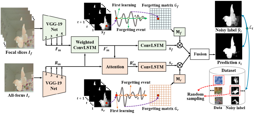 冯明涛博士长期从事复杂场景视觉感知与理解领域相关的研究工作,在学院良好科研环境支持下,所做系列工作相继发表在IEEE TIP、PR、ICCV等期刊会议,并入选2021年青年托举人才,是论文“基于像素级噪声标签的学习策略:一个光场显著性检测的新视角”(“Learning from Pixel-Level Noisy Label : A New Perspective for Light Field Saliency Detection”)的第一作者,张亮教授是该论文的通讯作者,合作者有湖南大学王耀南教授、澳大利亚西澳大学Ajmal Mian教授等,西安电子科技大学是该论文的第一完成单位及通讯作者单位。该论文受人类学习过程中“学习-遗忘-再学习”的机制所启发,解析了不确定标签监督下深度网络模型训练过程中的遗忘规律,抑制不确定标签对深度网络模型训练的干扰,进而大幅度提升深度网络模型的鲁棒性和稳定性。