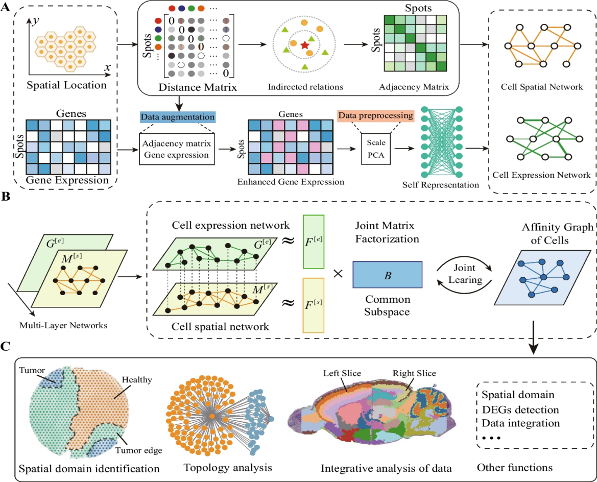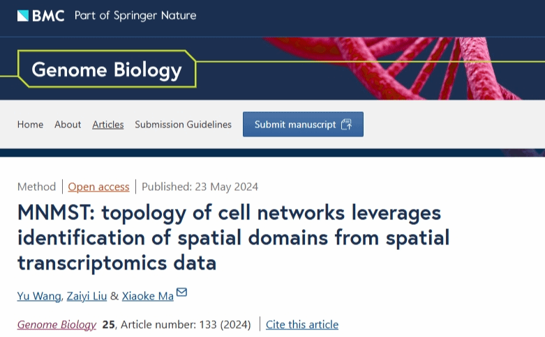 近日,世界杯(中国)陕西省智能人机交互与可穿戴技术重点实验室、智能媒体与数据工程研究所马小科教授团队在基因组学顶级期刊《Genome Biology》(五年IF=17.4)发表研究成果“MNMST: topology of cell networks leverages identification of spatial domains from spatial transcriptomics data”,第一作者为世界杯(中国)二年级博士生王昱,唯一通讯作者为马小科教授,合作者为广东省人民医院刘再毅主任医师。