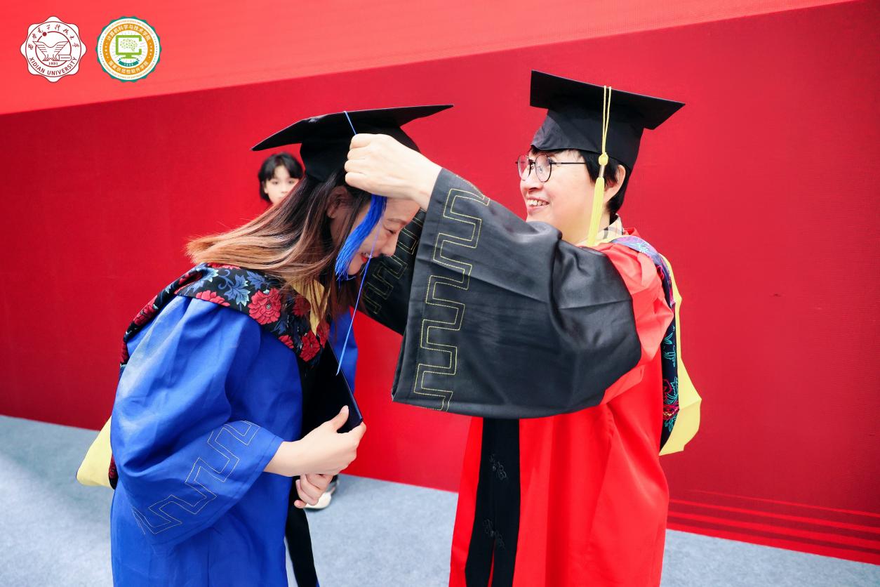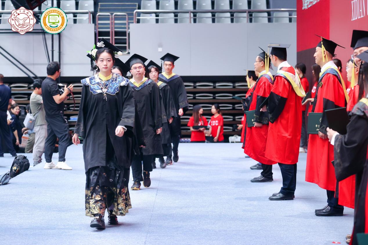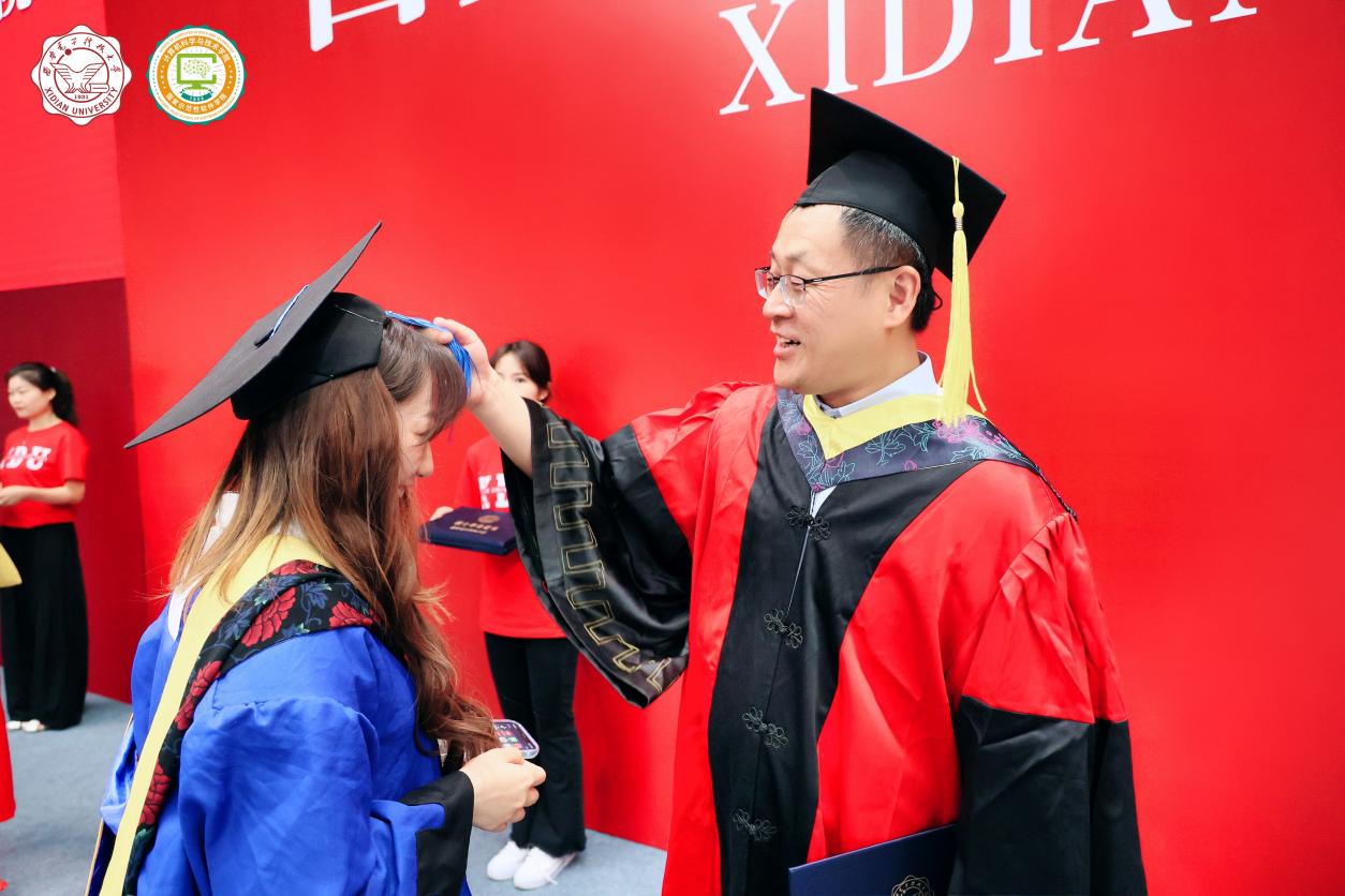 伴随着激扬、欢快的音乐,毕业生们整理好学位服、学位帽,排着整齐的队伍依次上台,向授位嘉宾鞠躬致敬,授位嘉宾一一为同学们拨穗、授位,并留下了宝贵的合影。与会领导、老师,全体毕业生共同见证这神圣而庄严的时刻。