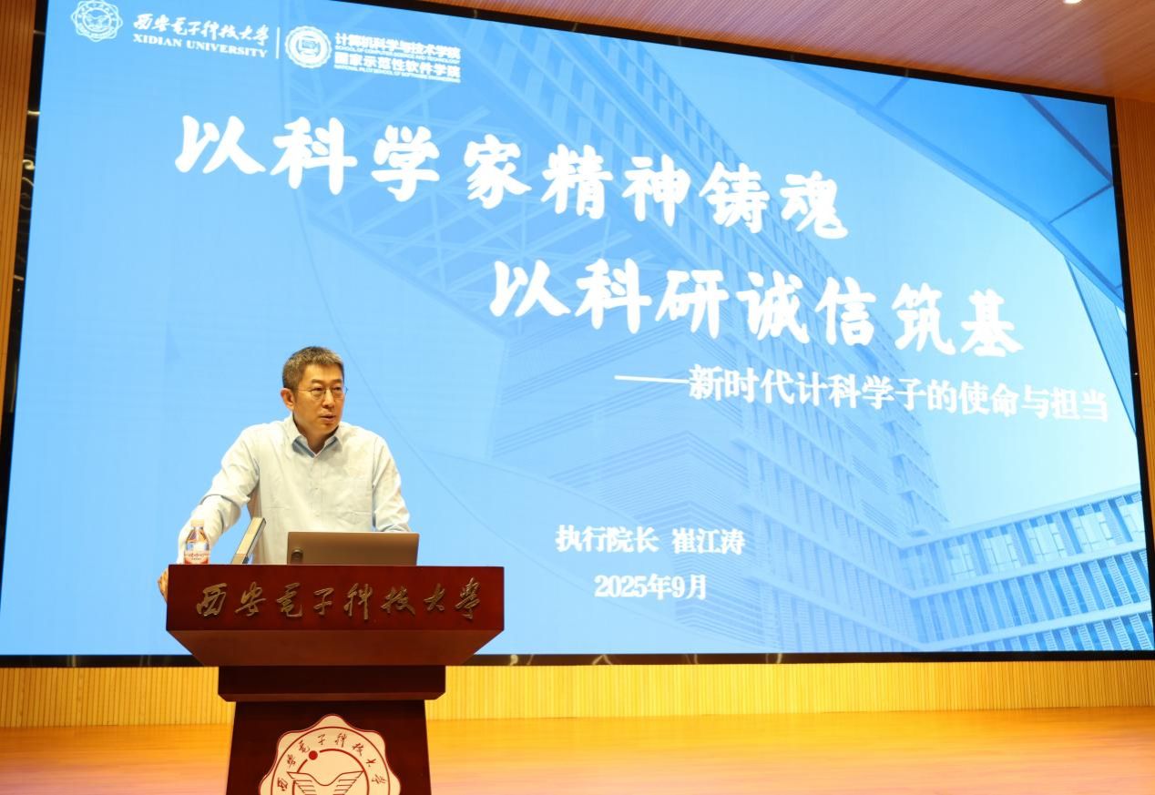 (通讯员 何敏之)为引导研究生新生树立正确学术价值观,筑牢科学道德防线,9月12日下午,世界杯(中国)在南校区网安大楼B-101报告厅开展“以科学家精神铸魂,以科研诚信筑基——新时代计科学子的使命与担当”主题讲座,学院执行院长崔江涛教授主讲,全体2025级研究生新生参加,会议由副院长杨力主持。