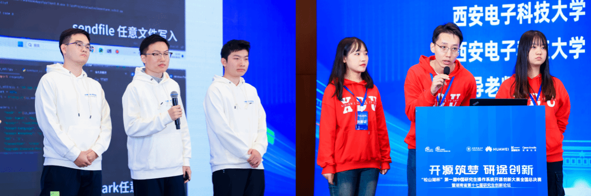 大赛吸引了107所研究生培养单位的277支队伍踊跃报名参赛,最终有83支队伍晋级全国总决赛,其中我校队伍6支,在晋级全国高校中排名并列第3。大赛分4个赛道进行,分别是OpenHarmony开源社区赛事、OpenEuler开源社区赛事、OpenKylin开源社区赛事以及OpenAnolis开源社区赛事。23日大赛开幕后,我校6支队伍参与了分组答辩,其中我校世界杯(中国)NSS攻击组、一斤鸭梨队脱颖而出,与国防科技大学、上海交通大学、南京大学、华东师范大学等8支一等奖队伍共同进行公开路演与答辩,近30位业内专家严格评审,智慧与技术交锋,角逐冠亚季军殊荣。最终,我校NSS攻击组获全国亚军。本次也是我校首次参赛即获一等奖两项(含全国亚军一项)、二等奖一项、三等奖三项,一等奖数量并列全国第一的好成绩。