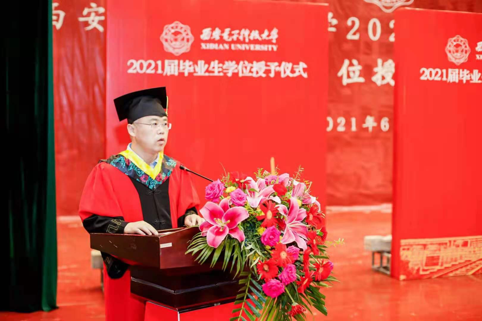 学院执行院长崔江涛教授深情寄语2021届毕业生。他希望同学们秉承西电“爱国为民”的家国情怀,以责任和担当诠释西电人的报国之志、爱国之情,“无论走多远,都不要忘了自己是西电人,是西电计算机人”;谨记西电“厚德”之校训,学会心胸开阔,能够关心、爱护别人,严于律己、宽以待人,“无论道多难,都不要忘了厚德载物”;谨记西电“求真”之校训,用专业的科学知识和严谨的科学态度,脚踏实地练好本领,在追求卓越的路上绽放出耀眼的光芒,“无论攀多高,都不要忘了求真务实”;谨记“励学”之校训,在巨大的变革中保持自己的独立思考的能力,坚持终身学习,持续进步,不忘四年的所学所思,以科学理性的态度继续求索,“无论走多长,都不要忘了励学精进”;谨记“笃行”之校训,用思考、声音和行动去做出改变,用头脑、心灵和脚步去把梦想变为现实。“无论行多久,都不要忘了深思笃行”。最后崔江涛希望同学们,在工作学习之余去拥抱生活,发展自己的兴趣和特长,文明精神,野蛮体魄。最后,他祝福计科学子们初心不改,鸿鹄高飞,前程似锦,一生平安。
