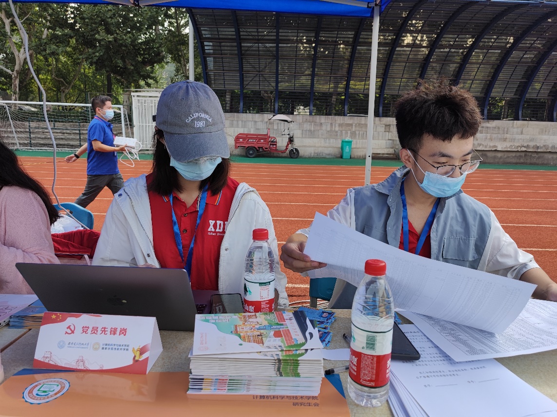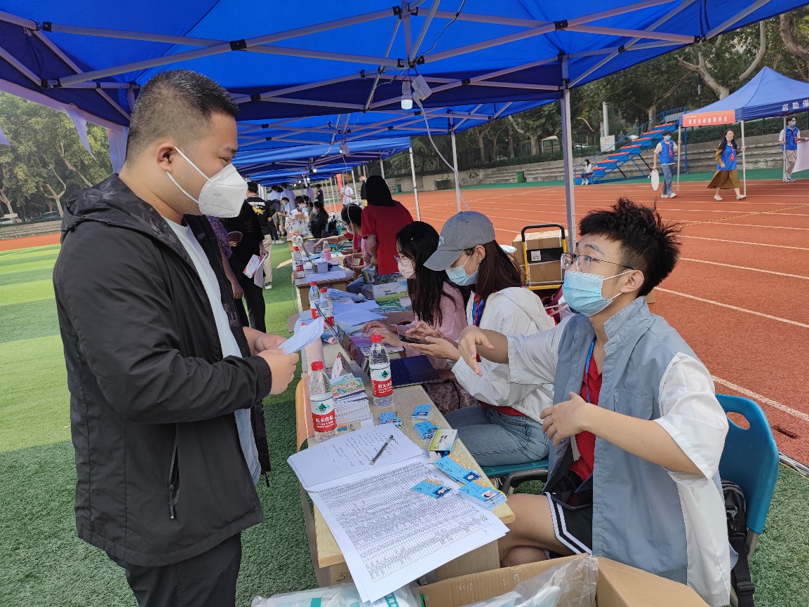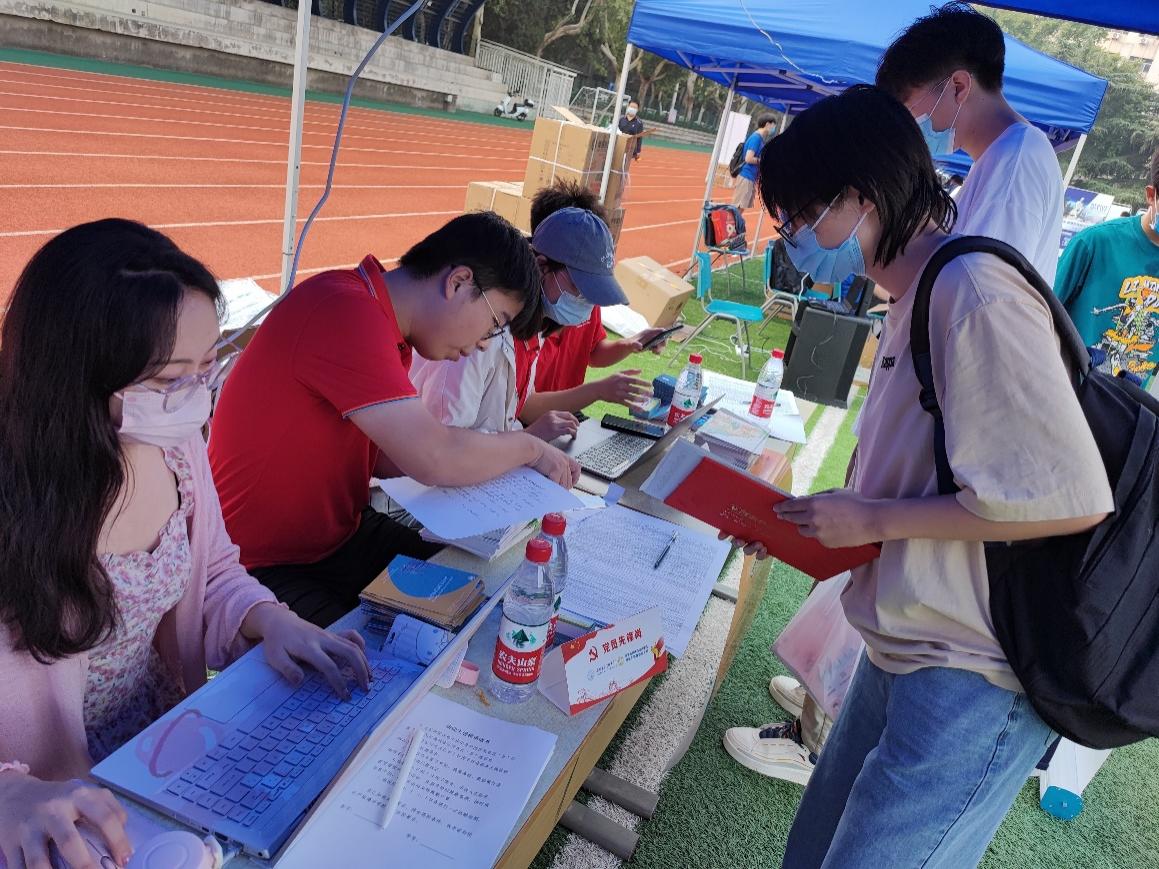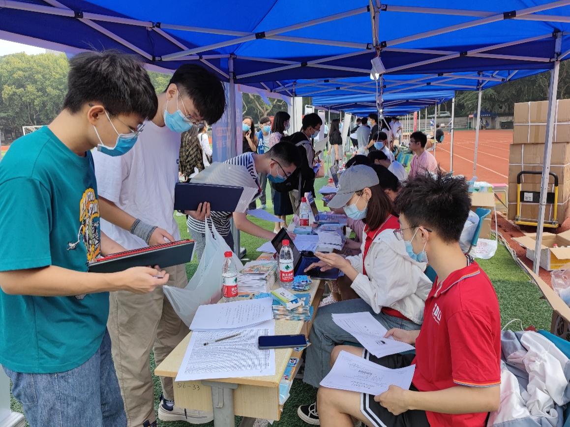 新生报到处,学院研究生辅导员、研究生会成员积极投入工作,学院还设立了迎新“党员先锋岗”发挥模范带头作用,确保疫情防控下的迎新工作顺利、有序进行。志愿者学长学姐们耐心引导新生完成报到流程,为大家发放研究生校园服务手册和口罩、体温计、不锈钢餐盒等爱心礼包,并热情的介绍校园环境。