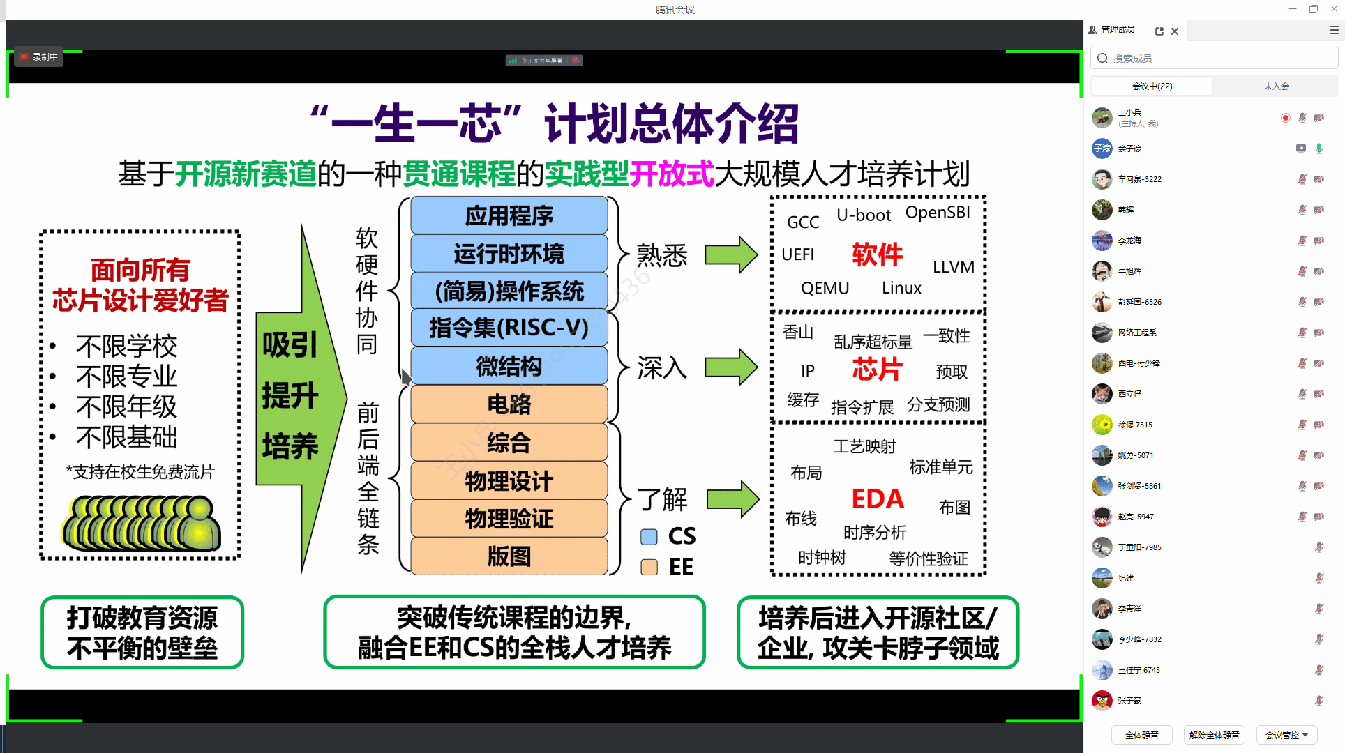 此次分享会展示了“一生一芯”计划在推动开源处理器芯片设计教学与实践中的重要作用,为学院实施“一生一系统”计划提供了宝贵经验,有助于提升计算机拔尖学生的计算机系统综合能力。