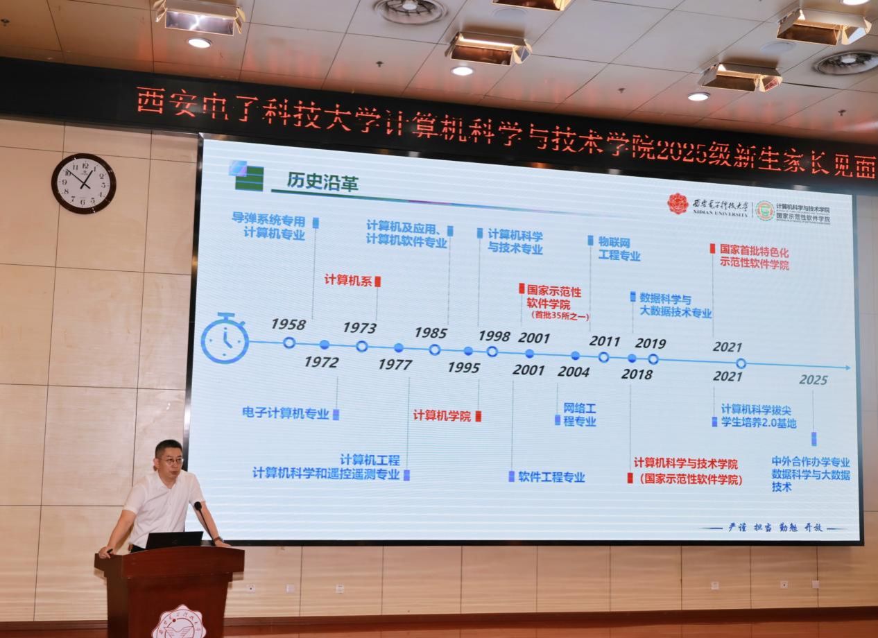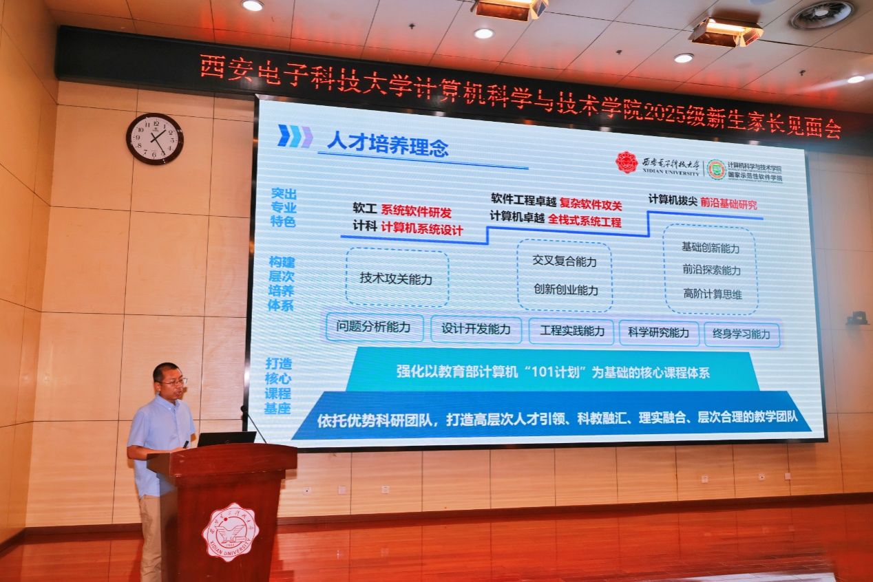 最后,学院党委书记李青山教授做总结讲话。他首先对到场的新生家长表示热烈欢迎,并就大家选择西电、选择计科院相关专业表示感谢。随后,他结合学院雄厚的学科实力与优渥的教学科研环境,强调学院作为“命根子系”“刀把子系”传承凝练出了十六字“三系精神”与八字院训,在专业培养与品格塑造方面发挥了优秀的“传帮带”作用。他殷切寄语各位新生尽早完成从高中生到大学生的身份认知和角色转变,独立自主克服生活与学业中的各项困难,在学有余力的前提下主动参与到学院相关研究所的科研实践中去,拓宽视野练就本领。同时,希望各位家长充分发挥家校育人合力,共同帮助学生成长为德才兼备、身心健康的国家栋梁。