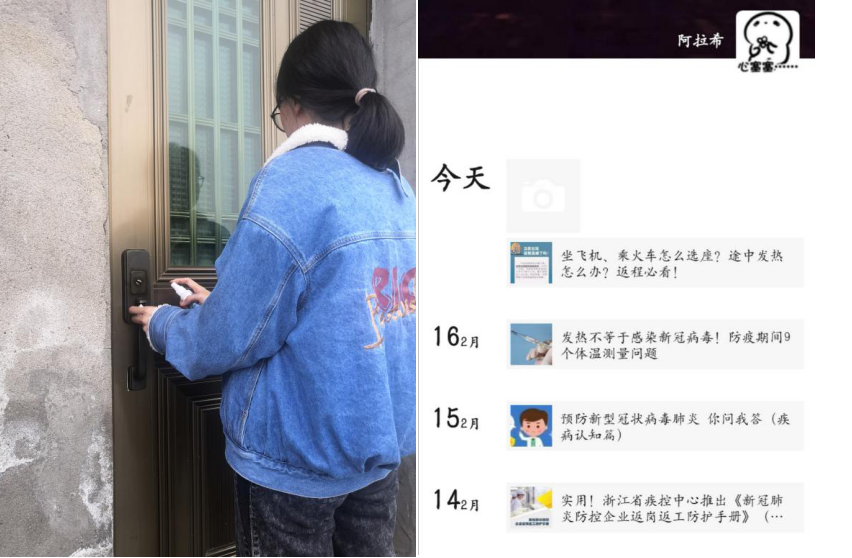 支部委员毛瑶瑶同志,主动为周围住户大门把手进行酒精消毒,并且还购入一次性口罩并无偿提供给有需要的邻居,每天在朋友圈宣传与防疫相关的知识。