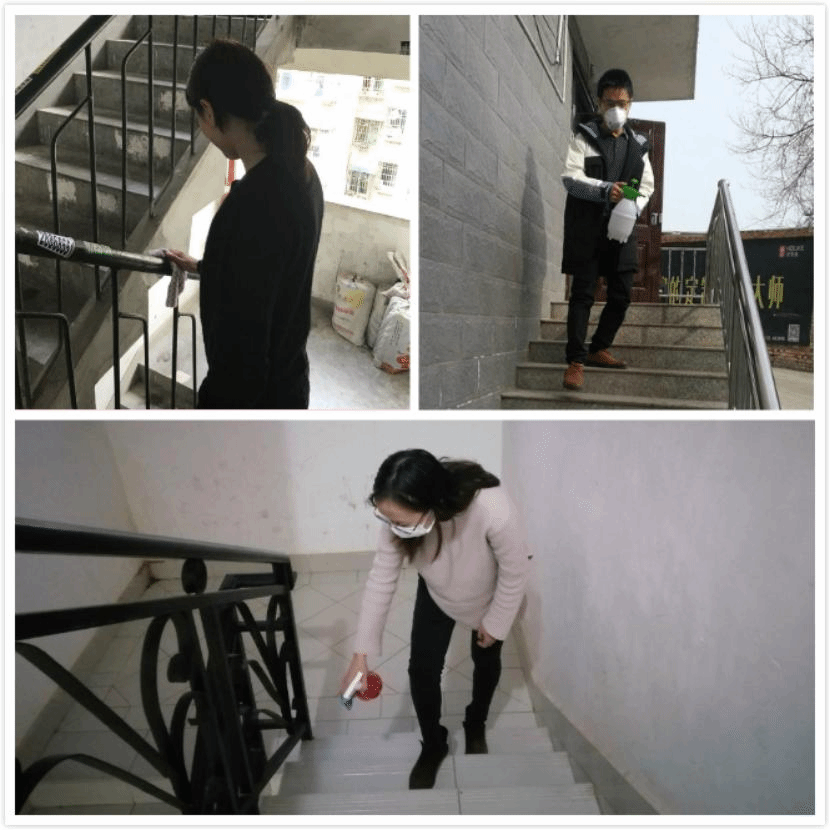 支部段坤钰、郑敏芝、黄旭楠等同志也主动积极地参加到擦拭扶手栏、清理消毒楼道的行动中,尽己所能为周围住户提供更加安全的居住环境。