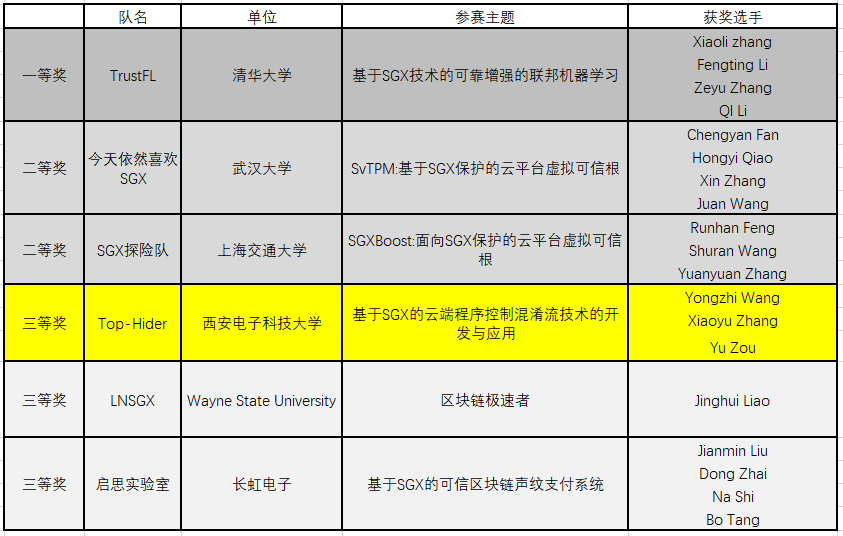 (通讯员 邹宇)11月18日至11月20日,由阿里云、浙江大学网络空间安全学院、阿里巴巴-浙江大学前沿技术联合研究中心联合发起、Intel赞助支持的首届SGX应用创意大赛在杭州IEEE IDSC上举行。来自清华大学、北京大学、上海交通大学、西安电子科技大学、长虹电子等知名高等院校团队和企业的87支队伍参加了这次比赛,争夺共6个获奖名额,获奖比率小至6.89% 。最终,我校世界杯(中国)NSS团队的代表队,TOP-HIDER的参赛作品“基于SGX的云端程序控制流混淆技术的开发与应用”在比赛中脱颖而出,获得三等奖,成为唯一获奖的西部高校。该参赛作品由王永智副教授指导,由硕士生邹宇、张小宇完成。