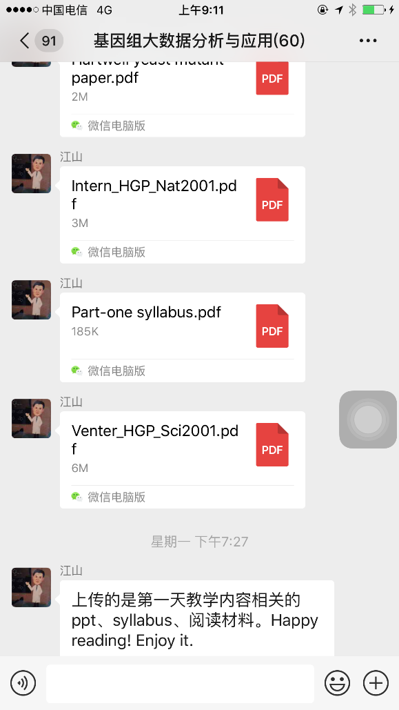 江山博士首先对同学们的相关知识背景,通过提问的方式做了一些调查,在了解同学们的基础上,对本课程的学习意义和学习目的进行了系统的介绍。江山博士以基因组大数据的独特性质、当前主流分析方法与应用、以及存在的挑战性问题贯穿课程的教学任务,并在课堂中通过讨论方式活跃上课气氛。在课后,江山博士通过微信群与同学进行交流,发送学习资料,布置相应任务等。江山博士丰富的学识以及详细生动的讲述使同学们纷纷表示受益匪浅。