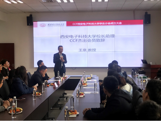成立大会首先由CCF常务理事周兴社教授致辞。他代表中国计算机学会向CCF西电学生分会的成立表示祝贺。他简要回顾了CCF学生分会的发展历程,阐述了CCF的章程及有关宗旨,周教授指出,目前CCF共有接近5万名会员,其中学生会员占CCF会员总数的三分之一,是CCF的重要后备力量,所以如何为学生会员提供更优质的服务是学生分会肩负的重要使命。周教授也表达了对CCF西电学生分会寄予的殷切期望。希望通过举办学术交流活动,让西电学生会员可以接触到更多的专业人士,同时要关注热点研究问题,针对专业界和产业界的社会话题等做广泛讨论,让广大学生会员在学生分会的平台上进行交流和提升。