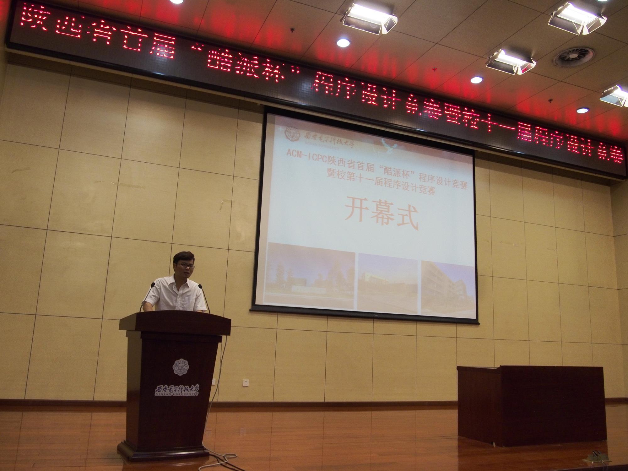 上午9点30分,开幕式在南校区行政楼206举行。130余名参赛选手和教练身着比赛服装参加了开幕式。西安电子科技大学实验室与设备处处长黄大林、计算机学院党委书记于晓飞、副院长王泉、西安交通大学软件学院副院长陈建明以及赞助商宇龙计算机通信科技有限公司西安研究所所长周佳庆先生等嘉宾出席。ACM/ICPC中国西部指导委员会委员周鹏教授专程从美国赶来出席开幕式。