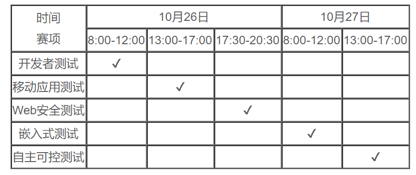 预选赛时间为10月26-27日。预选赛形式为互联网比赛,不限制比赛地点。参赛选手可任选赛项参赛,在时间不冲突的前提下可参加多个分项赛比赛。各分项赛具体比赛时间如下: