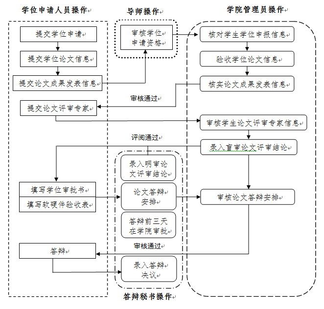 申请学位通过研究生管理系统进行,学位申请人员、导师、学院管理员及答辩秘书登录http://gr.xidian.edu.cn,在“研究生管理系统(新)”栏中进入,登录后流程如下: