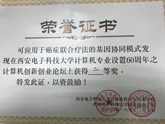 3.研究所师生团队研发的《可应用于癌症联合疗法的基因协同模式发现》系统,在西安电子科技大学计算机专业设置60周年之计算机创新创业论坛上,获得貮等奖。