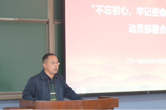 李青山作动员讲话,他谈到,学院“不忘初心、牢记使命”主题教育从9月开始,11月底基本结束,是当前和今后一个时期的一项重要政治任务。为组织开展好主题教育,9月16日学院召开两委会,传达中央、教育部党组和学校党委关于开展“不忘初心、牢记使命”主题教育的安排部署,以及学校9月12日“不忘初心、牢记使命”主题教育动员部署会精神,对学院主题教育开展进行专题研讨。9月18日学院召开党委会,讨论通过了学院“不忘初心、牢记使命”主题教育工作方案,成立了领导小组和联络小组,为启动学院主题教育进行了思想准备和组织准备。