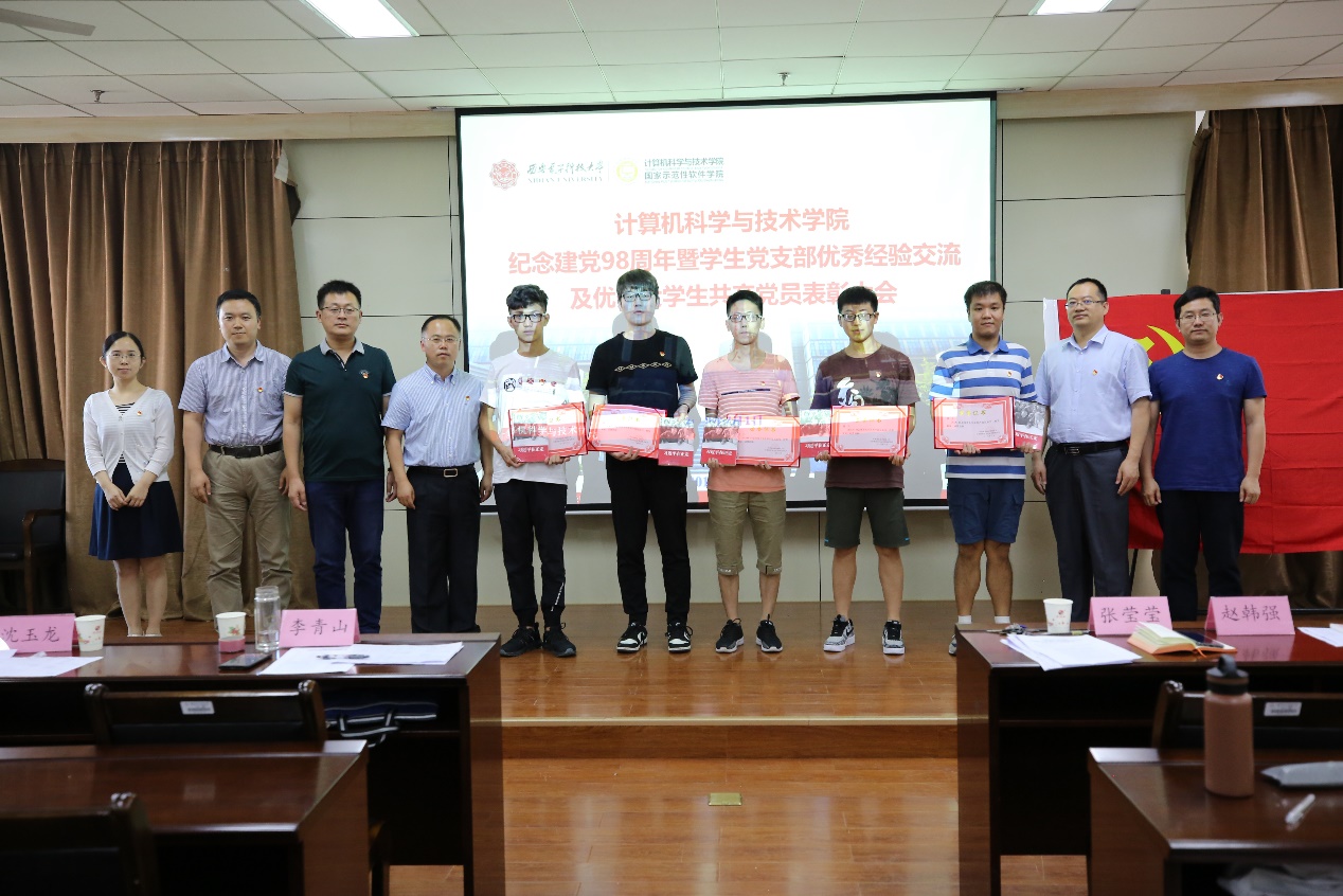 学院党委副书记张莹莹宣读表彰决定:学校党委授予张克、郝晓阳、葛道辉等3名同学“校级优秀大学生共产党员”称号,学院党委授予徐聪、刘汪洋、李永顺、马海洋、段然、李雨桐等6名同学“学院优秀大学生共产党员”称号。学院党委书记李青山、副院长苗启广、副院长赵韩强、计算机科学系党支部书记戚玉涛、软件工程系党支部书记宋胜利分别为受表彰的学生党员颁奖。