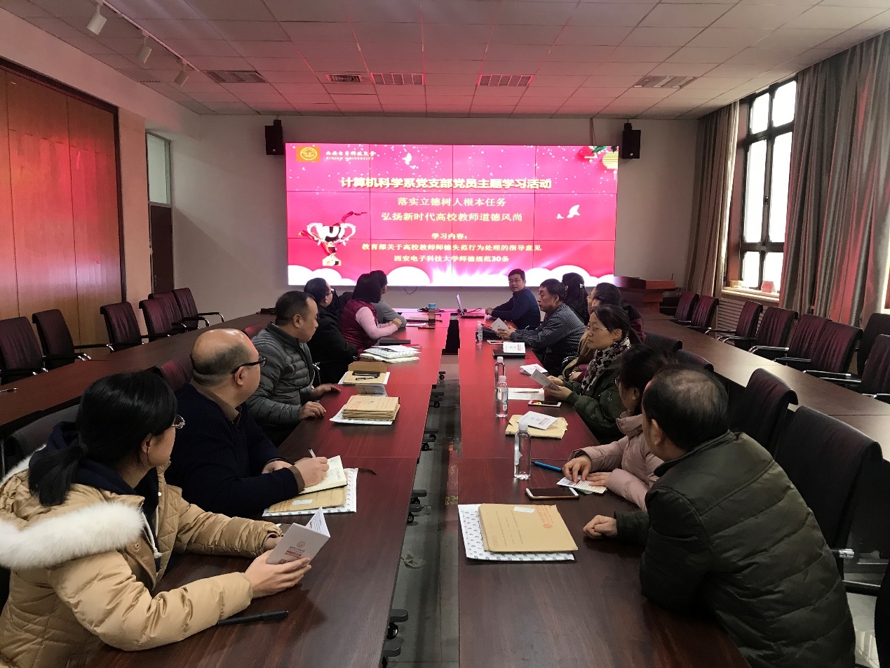 (通讯员 王晓丽,同榛)2018年12月25日下午,世界杯(中国)计算机科学系党支部在北校区主楼二区319会议室召开以“落实立德树人根本任务、弘扬新时代高校教师道德风尚”为主题的学习活动,深入学习了《新时代高校教师职业行为十项准则》、《教育部关于高校教师师德失范行为处理的指导意见》和《西安电子科技大学师德规范30条》。计算机科学系全体党员参加,会议由计算机科学系党委书记戚玉涛同志主持。