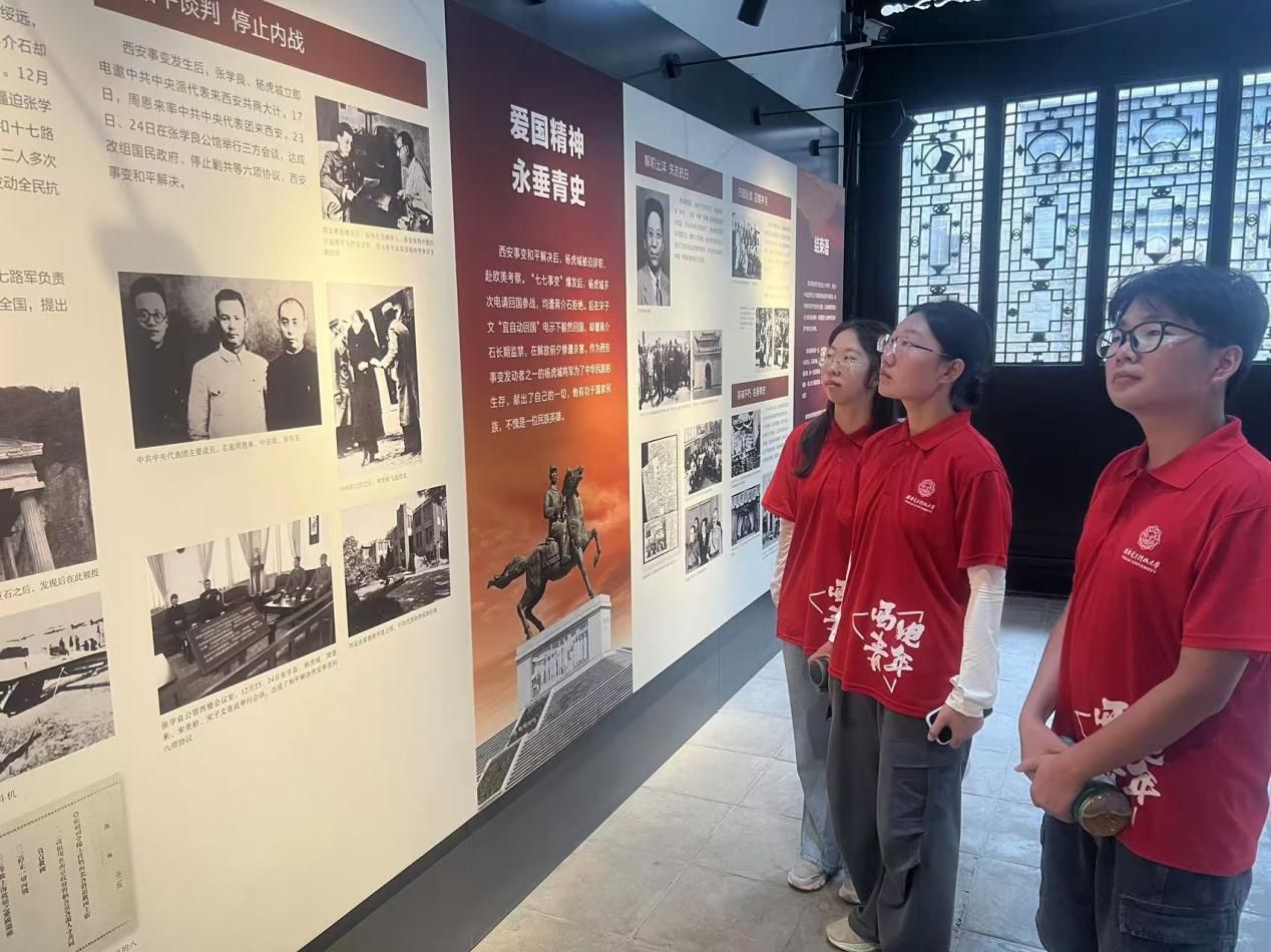 在杨虎城纪念馆,实践团队成员在珍贵史料中追寻红色记忆。馆内通过复原陈列、影像资料与沉浸式场景,生动再现了杨虎城将军的爱国事迹与西安事变的历史脉络。作为全国重点文物保护单位和爱国主义教育基地,这里每年接待研学团队超500批次,成为传承红色基因、培育家国情怀的重要课堂。
