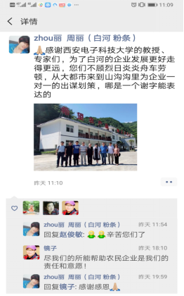 此次受帮扶的企业深受感动,白河县希望农产品加工有限公司周总经理谈到:“感谢西安电子科技大学的教授与专家们,为了白河的企业走得更好更远,您们不顾烈日炎炎舟车劳顿,从大城市来到山沟沟里为企业一对一的出谋划策,哪是一个谢字能表达的。感谢感恩。”