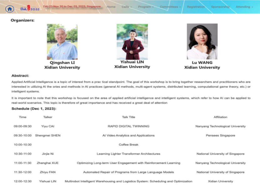 澎思科技首席科学家、澎思科技新加坡研究院院长Shengmei SHEN,新加坡南洋理工大学Yiyu CAI教授,新加坡国立大学Jinjie Ni博士,新加坡南洋理工大学博士生Zhenghai XUE和我校蔺一帅副教授等研究学者为参会人员带来了以AI Video Analytics and Applications、Rapid Digital Twinning、Learning Lighter Transformer Architectures、Optimizing Long-term User Engagement with Reinforcement Learning以及Multirobot Intelligent Warehousing and Logistics System: Scheduling and Optimization等为主题的报告分享。与此同时,作为研讨会主持人,蔺一帅副教授向与会人员介绍了西安电子科技大学软件工程学科相关研究方向的人才需求,真诚的欢迎国内外学者和同学们加入我校。