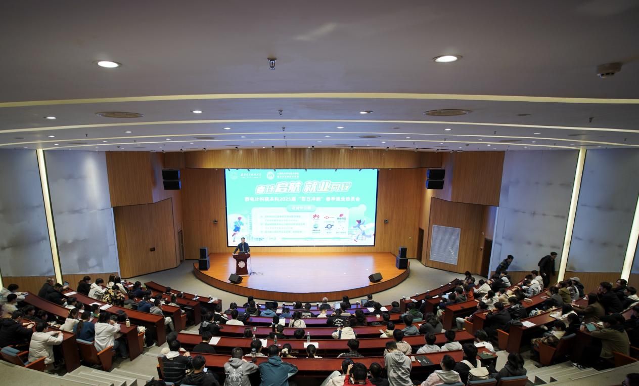 3月14日下午,计科院组织“春计启航·就业同行”——百日冲刺春季就业动员会,学院党委书记李青山、就业指导服务中心詹奉珍、学院分管本科学生工作相关负责同志,以及计科院200余名本科生参与活动。动员会现场搭起就业推荐平台,邀请了华为、汇丰科技中国、金山办公、深信服科技、葡萄城、腾讯云智研发六家企业作宣讲和现场招聘。
