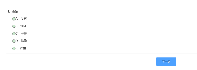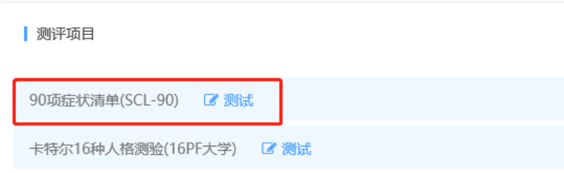 点击“心理测评”图标后,可看到参与测试的量表“90项症状清单”;点击量表名称后面的“铅笔“图标,即可开始测试,如下图: